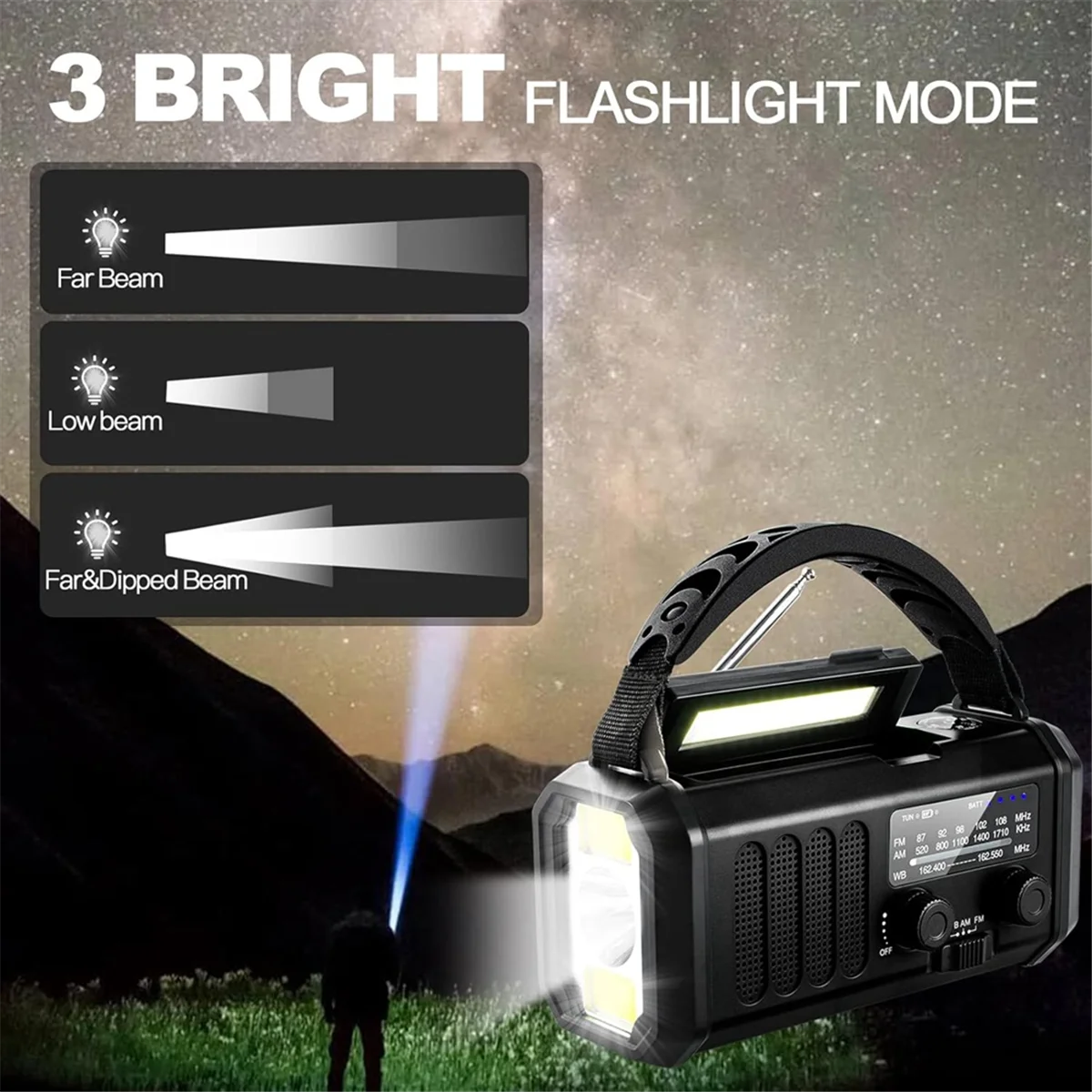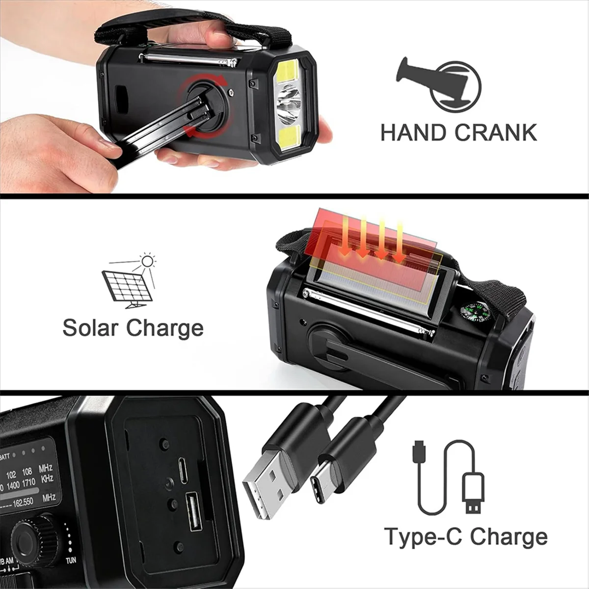 This 4-in-1 Emergency Portable Radio is the essential companion for camping, hiking, and emergencies. With a high-capacity 10,000mAh battery, solar power, a hand crank, and multi-function functions, it ensures you'll never be without light, information, or powerโeven in the most critical moments.